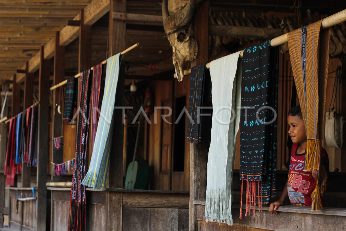 Seorang anak melihat kain tenun khas Ngada di Desa Tiworiwu, Kabupaten Ngada, Senin (29/9/2025). Kerajinan kain tenun ikat khas Ngada yang menggambarkan kehidupan dan nilai-nilai budaya masyarakat setempat tersebut dijual dengan harga Rp250 ribu hingga Rp1,5 juta per lembar kain serta telah dipasarkan ke sejumlah daerah di Indonesia. ANTARA FOTO/Mega Tokan/sgd/nz