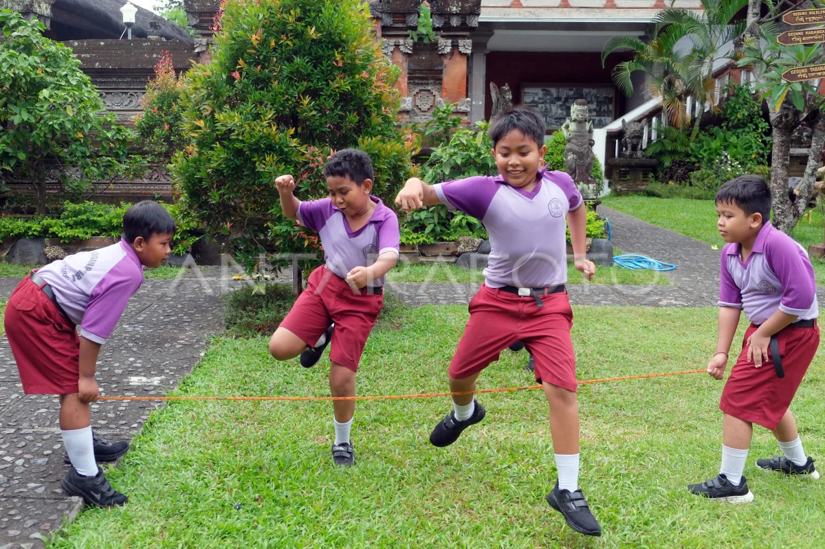 Siswa SD bermain lompat karet saat edukasi permainan tradisional di Museum Bali, Denpasar, Bali, Selasa (30/9/2025). Edukasi permainan tradisional yang digelar 29 September hingga 15 Oktober 2025 tersebut diikuti ratusan siswa SD secara bergiliran untuk memperkenalkan permainan tradisional yang tergeser pengaruh teknologi terutama gawai dan sebagai upaya melestarikan budaya daerah. ANTARA FOTO/Nyoman Hendra Wibowo/rwa.