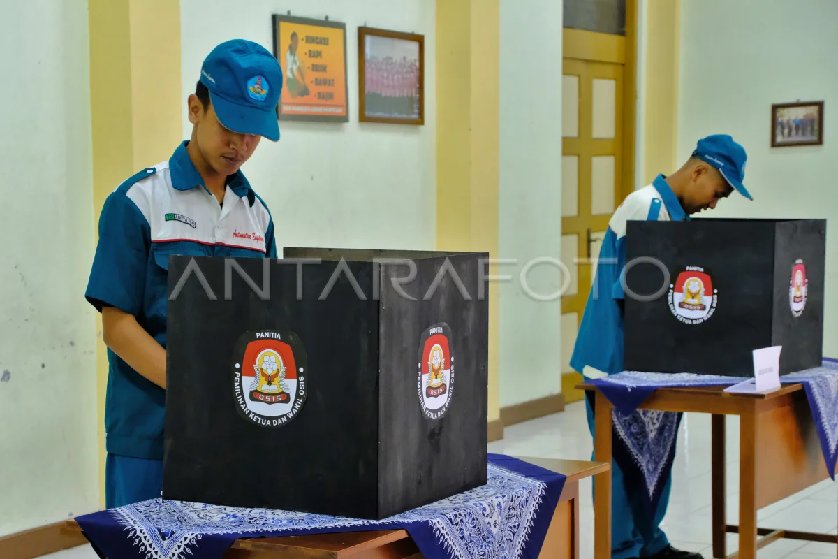 Dua siswa mencoblos surat suara saat pemilihan ketua OSIS di SMK Katholik Pangudi Luhur Muntilan, Magelang, Jawa Tengah, Selasa (30/9/2025). Pemilihan ketua OSIS yang dilakukan seperti layaknya pemilihan kepala daerah bertujuan untuk pendidikan demokrasi sekaligus untuk mengajak pemilih pemula berpartisipasi pada pilkada maupun pemilu mendatang. ANTARA FOTO/Anis Efizudin/rwa.