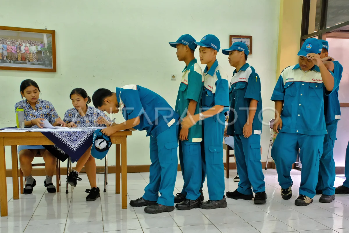 Sejumlah siswa antre menggunakan hak pilihnya saat pemilihan ketua OSIS di SMK Katholik Pangudi Luhur Muntilan, Magelang, Jawa Tengah, Selasa (30/9/2025). Pemilihan ketua OSIS yang dilakukan seperti layaknya pemilihan kepala daerah bertujuan untuk pendidikan demokrasi sekaligus untuk mengajak pemilih pemula berpartisipasi pada pilkada maupun pemilu mendatang. ANTARA FOTO/Anis Efizudin/rwa.