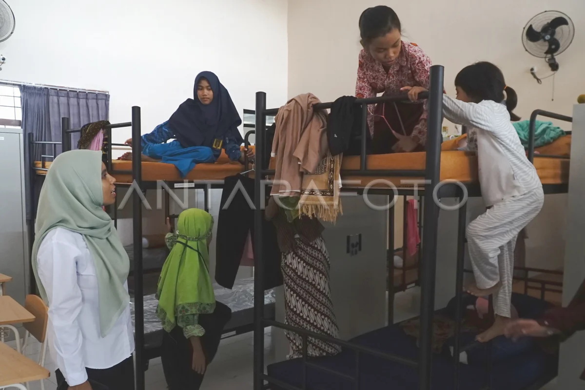 Guru mengasuh siswa saat mengikuti kegiatan Masa Pengenalan Lingkungan Sekolah (MPLS) pada hari pertama operasional Sekolah Rakyat Terintegrasi (SRT) Trenggalek, Jawa Timur, Rabu (1/10/2025). Sekolah Rakyat ke-50 di Indonesia itu menampung 69 siswa dengan sistem asrama sebagai upaya pemerintah untuk memperluas akses pendidikan inklusif bagi anak-anak dari keluarga prasejahtera maupun penyandang disabilitas. ANTARA FOTO/Destyan Sujarwoko/nym.