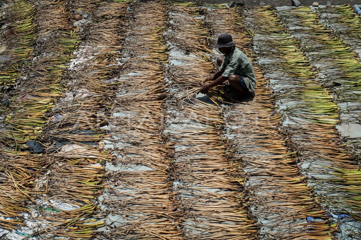 Warga menjemur tanaman eceng gondok di Pakuhaji, Kabupaten Tangerang, Banten, Rabu (1/10/2025). Tanaman gulma tersebut dijual oleh warga setempat kepada perajin sebagai bahan baku produksi kerajinan tangan dengan harga Rp500 per kilogram untuk eceng gondok basah dan Rp6.000 per kilogram untuk eceng gondok kering. ANTARA FOTO/Putra M. Akbar/foc.