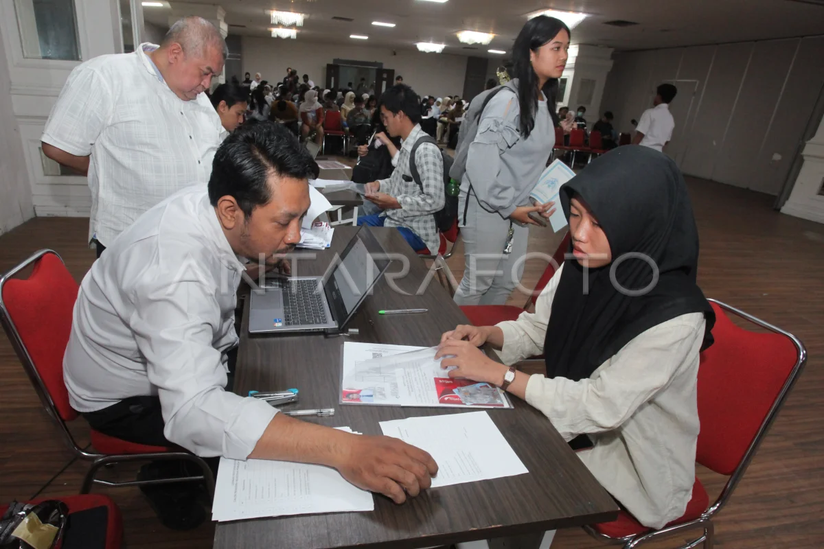 Petugas melayani mahasiswa yang melakukan pendaftaran ulang Beasiswa Pemuda Tangguh 2025 di Surabaya, Jawa Timur, Rabu (1/10/2025). Pemerintah Kota Surabaya menetapkan sebanyak 2.766 mahasiswa yang berdomisili di Surabaya dinyatakan lolos sebagai penerima beasiswa dalam program Besiswa Pemuda Tangguh untuk periode September 2025, dan total secara keseluruhan pada tahun 2025 Pemkot Surabaya menerima 5.908 mahasiswa sebagai penerima beasiswa tersebut. ANTARA FOTO/Didik Suhartono/tom.
