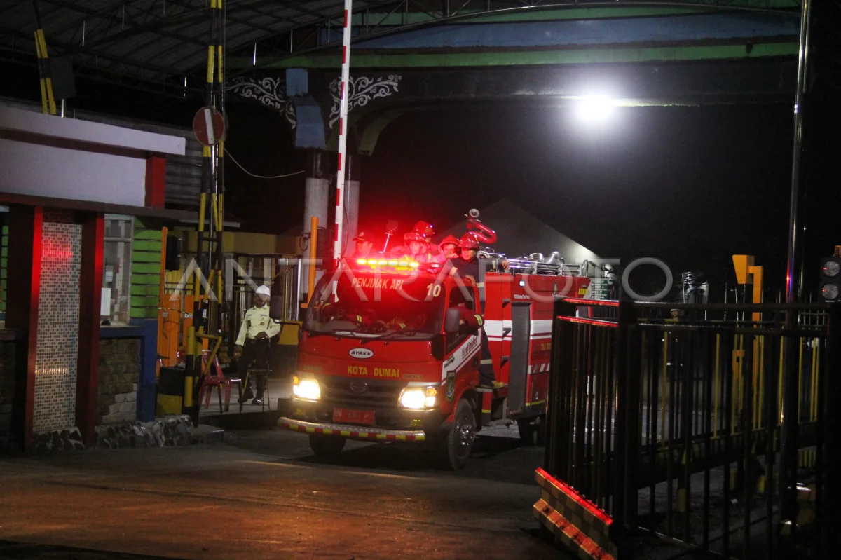Sebuah mobil pemadam kebakaran meninggalkan kawasan kilang minyak seusai memadamkan api di area Hydrocracking Complex (HCC) yang terbakar di Kilang Minyak Putri Tujuh Pertamina RU II Dumai, Riau, Rabu (1/10/2025). Manajer Humas Pertamina Refinery Unit II Dumai Agustiawan menyatakan kebakaran di Kilang Minyak Pertamina Dumai terjadi di area HCC dan penyebab kebakaran yang membuat lima warga yang tinggal dekat kawasan kilang dilarikan ke rumah sakit untuk mendapatkan perawatan medis itu masih dalam penyelidikan. ANTARA FOTO/Aswaddy Hamid/bar