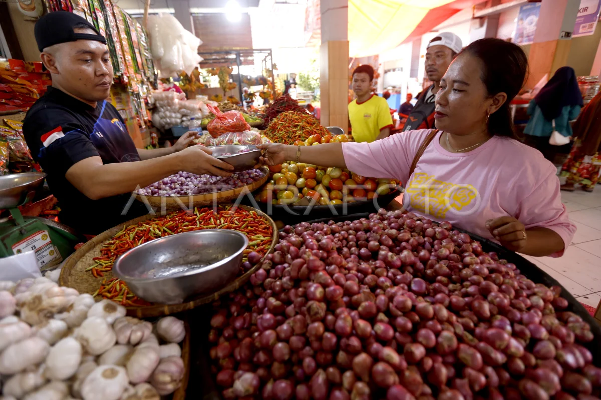 Pedagang menimbang pesanan pembeli di lapak bumbu masakan di Pasar Sentral, Kota Gorontalo, Gorontalo, Kamis (2/10/2025). Badan Pusat Statistik (BPS) mencatat pada bulan September 2025, Provinsi Gorontalo mengalami deflasi bulan ke bulan 0,12 persen dan bawang merah menjadi komoditas penyumbang utama deflasi dengan andil 0,30 persen disusul beras 0,14 persen, cumi-cumi 0,06 persen, angkutan udara 0,03 persen, tomat 0,02 persen, ikan teri 0,02 persen, ikan bubara 0,01 persen, pengharum cucian 0,01 persen dan parfum 0,01 persen. ANTARA FOTO/Adiwinata Solihin/bar