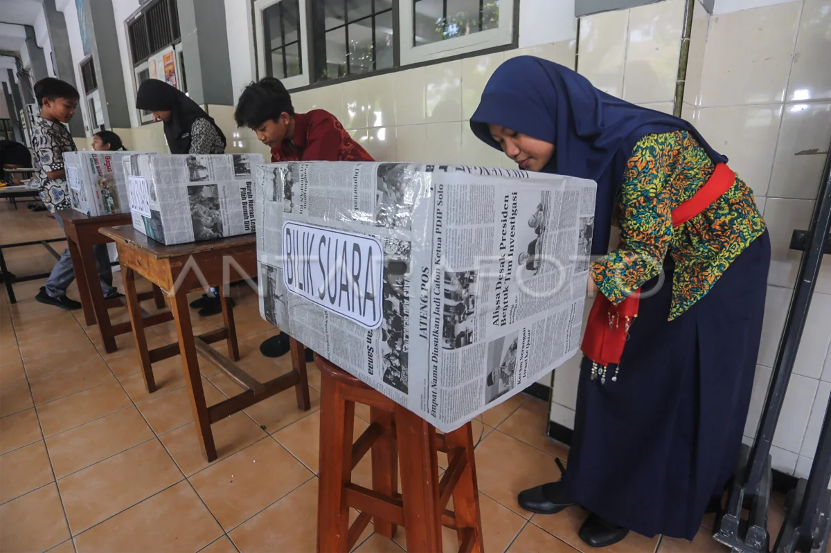 Sejumlah siswa melakukan proses pencoblosan surat suara di dalam bilik suara dalam kegiatan pemilihan ketua OSIS dengan sistem Pemilihan Umum (Pemilu) di SMP Negeri 9 Kota Semarang, Jawa Tengah, Kamis (2/10/2025). Kegiatan yang diikuti siswa di lingkungan SMP tersebut diselenggarakan pihak sekolah sebagai upaya sarana edukasi mengenalkan kepada para pelajar tentang proses berdemokrasi serta mengenalkan pelaksanaan tahapan Pemilu. ANTARA FOTO/Makna Zaezar/bar