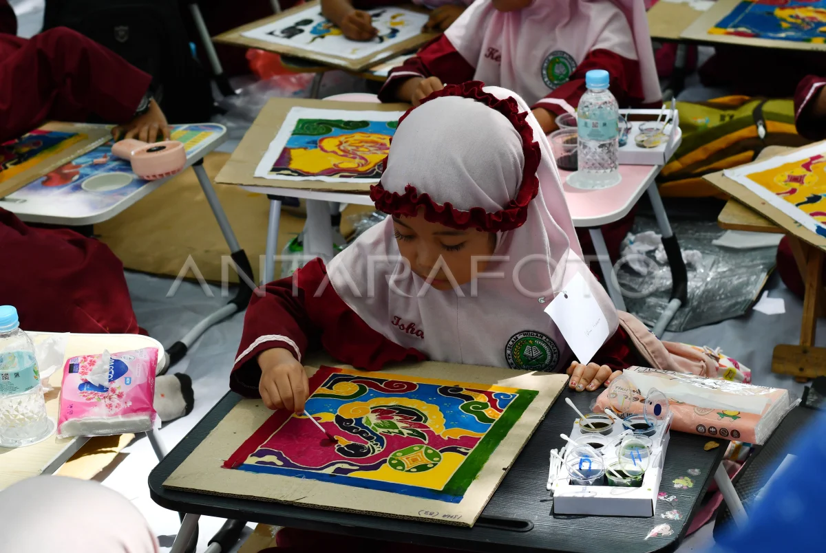 Peserta mewarnai kain batik saat mengikuti lomba membatik Gebyar Ayo Membatik dalam rangka memperingati Hari Batik Nasional di Kota Madiun, Jawa Timur, Kamis (2/10/2025). Lomba mewarnai batik yang digelar pengurus Ikatan Guru Taman Kanak-kanak Indonesia (IGTKI) bersama Persatuan Guru Republik Indonesia (PGRI) Provinsi Jawa Timur tersebut diikuti sekitar 400 anak TK dimaksudkan untuk memperkenalkan dan mengajak anak-anak mencintai batik sebagai warisan budaya. ANTARA FOTO/Siswowidodo/bar