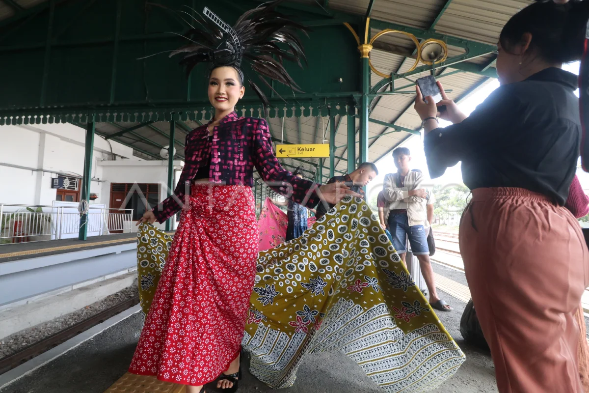 Model memperagakan busana batik saat peringatan Hari Batik Nasional di Stasiun Kota Kediri, Jawa Timur, Kamis (2/10/2025). Peragaan busana batik yang diikuti salah satunya sebagai model penyandang disabilitas tersebut sebagai upaya PT Kereta Api Indonesia mempromosikan layanan transportasi yang aman, nyaman, dan ramah disabilitas. ANTARA FOTO/Prasetia Fauzani/agr