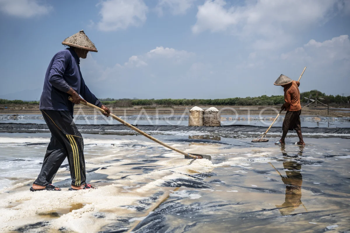 Petani memanen garam di area tambak garam rakyat, Desa Bulakbaru, Kedung, Jepara, Jawa Tengah, Kamis (2/10/2025). Menurut sejumlah petani setempat produksi garam menurun pada musim panen dari yang biasanya mencapai 1.000 karung (40 kilogram per karung) menjadi hanya sekitar 500 karung karena hujan yang masih sering turun sehingga mengganggu proses produksi. ANTARA FOTO/Aprillio Akbar/agr