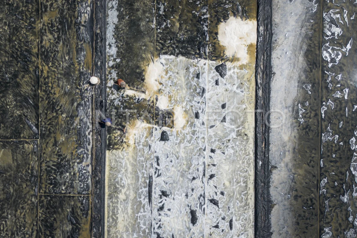 Foto udara petani memanen garam di tambak garam rakyat di Desa Bulakbaru, Kedung, Jepara, Jawa Tengah, Kamis (2/10/2025). Menurut sejumlah petani setempat produksi garam menurun pada musim panen dari yang biasanya mencapai 1.000 karung (40 kilogram per karung) menjadi hanya sekitar 500 karung karena hujan yang masih sering turun sehingga mengganggu proses produksi. ANTARA FOTO/Aprillio Akbar/agr