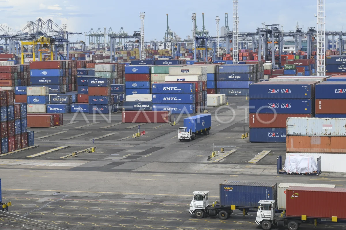 Truk yang membawa peti kemas melintas di Pelabuhan Tanjung Priok, Jakarta, Kamis (2/10/2025). Badan Pusat Statistik (BPS) menyebutkan Indonesia memperoleh surplus neraca perdagangan 64 bulan berturut-turut setelah pada Agustus 2025 berhasil mencatatkan surplus sebesar 5,49 miliar dolar AS. ANTARA FOTO/Hafidz Mubarak A/nym.