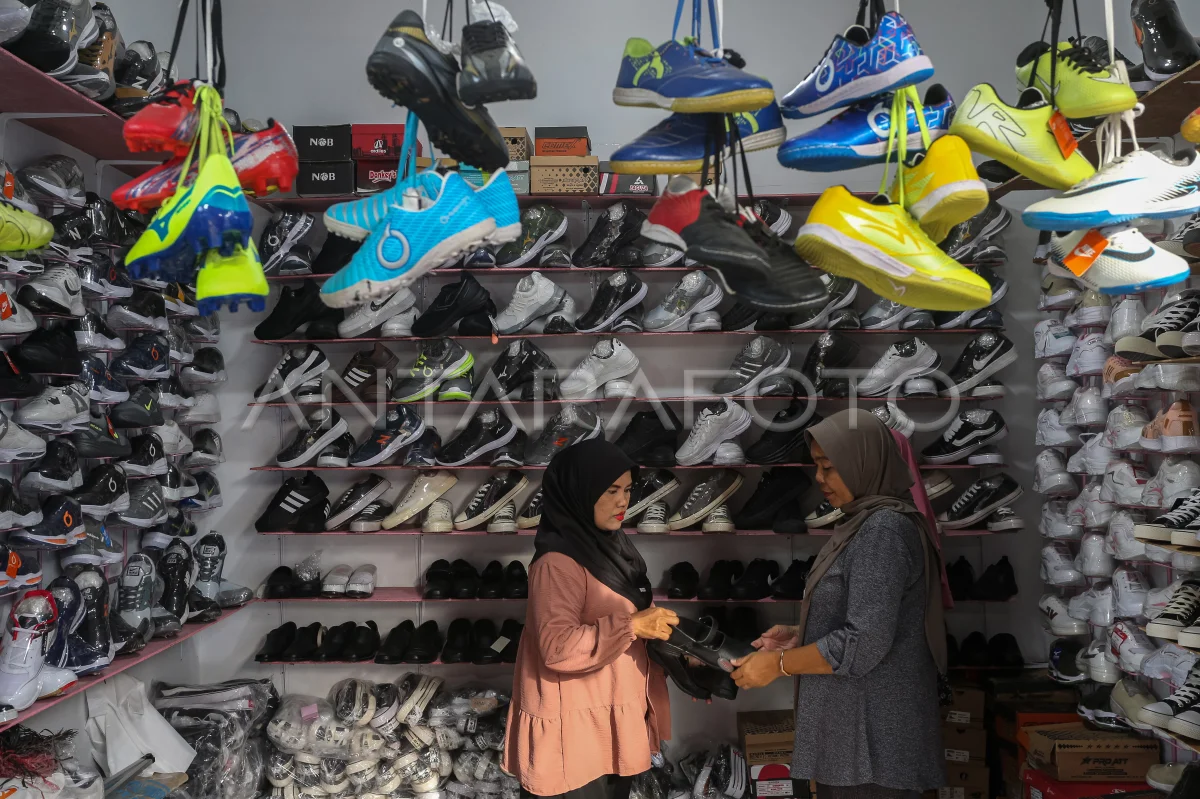 Penjual sepatu melayani pembeli di Pasar Kepandean, Kota Serang, Banten, Jumat (3/10/2025. Badan Pusat Statistik (BPS) Provinsi Banten mencatat pada September 2025 secara tahunan, Banten mengalami inflasi sebesar 2,31 persen dengan Indeks Harga Konsumen (IHK) sebesar 107,90 yang disebabkan adanya kenaikan harga pada sembilan kelompok pengeluaran, diantaranya kelompok makanan, minuman dan tembakau sebesar 4,46 persen serta pakaian dan alas kaki sebesar 1,35 persen. ANTARA FOTO/Angga Budhiyanto/YU