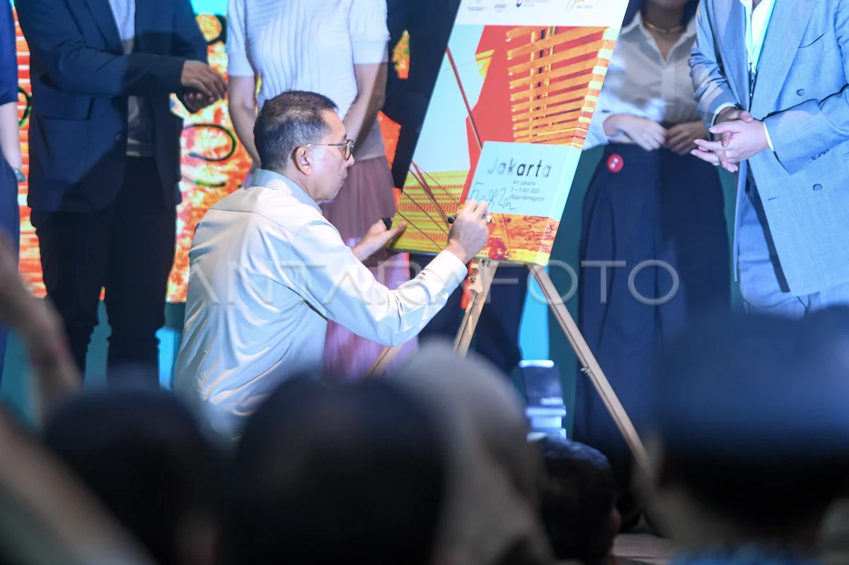 Menteri Kebudayaan Fadli Zon menandatangani poster saat membuka acara pameran seni rupa Art Jakarta 2025 di JIExpo Kemayoran, Jakarta, Jumat (3/10/2025). Art Jakarta 2025 menghadirkan 75 galeri seni dari 16 negara dan berlangsung 3-5 Oktober 2025. ANTARA FOTO/Muhammad Adimaja/sgd