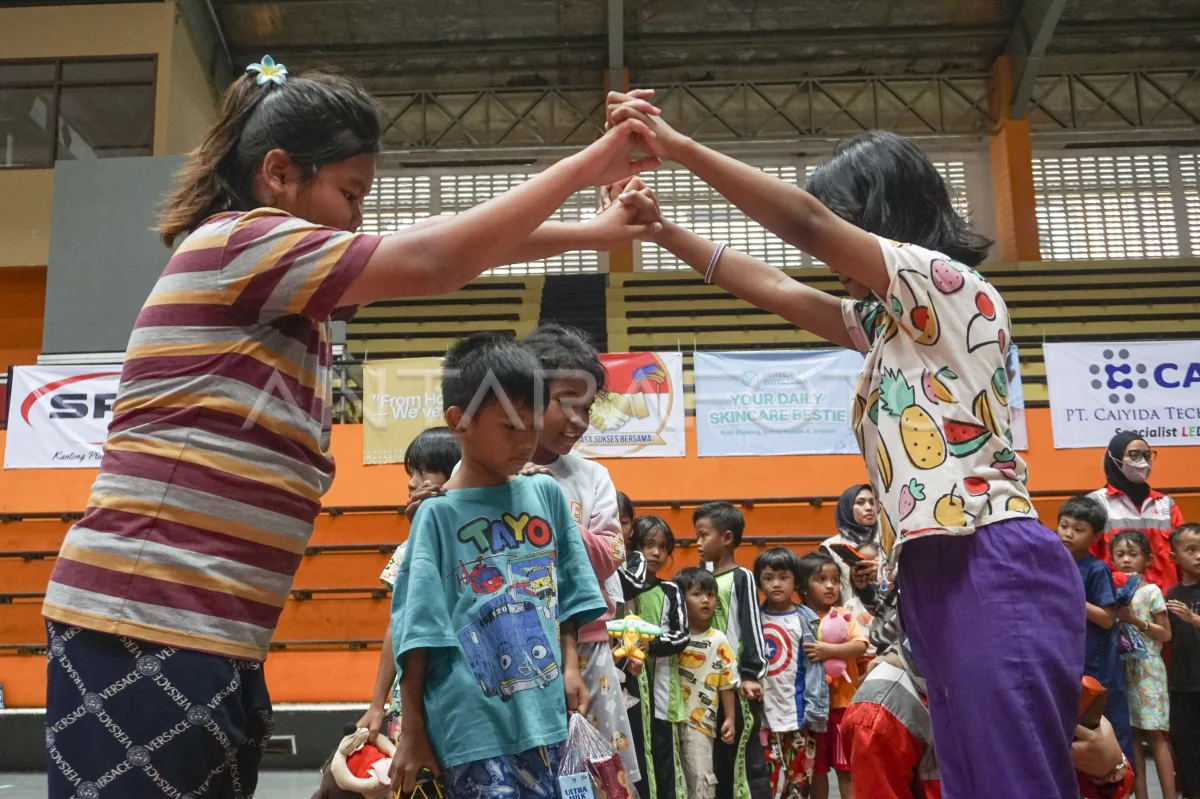 Relawan bermain bersama anak-anak korban kebakaran permukiman Taman Sari di GOR Lokasari, Jakarta, Jumat (3/10/2025). BPBD, PMI, dan relawan lainnya menggelar Layanan Dukungan Psikososial (LDP) berupa kegiatan bermain, terapi, konseling, senam bersama, serta dukungan emosional dan sosial tersebut untuk memulihkan kondisi psikologi masyarakat pascakebakaran yang melanda pemukiman mereka. ANTARA FOTO/Ika Maryani/hma/sgd