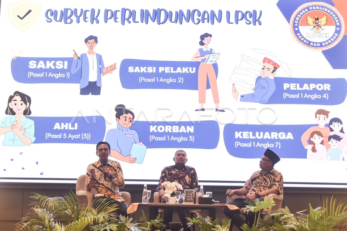 Wakil Ketua Lembaga Perlindungan Saksi dan Korban (LPSK) Wawan Fahruddin (kiri) bersama anggota Komisi XIII DPR Agun Gunandjar Sudarsa (tengah) menyampaikan paparannya pada diskusi urgensi perlindungan saksi dan korban tindak pidana di Pangandaran, Jawa Barat, Sabtu (4/10/2025). Kegiatan yang dihadiri masyarakat, mahasiswa, akademisi, dan pemerintah daerah itu bertujuan meningkatkan pemahaman tentang tugas, fungsi, serta kewenangan LPSK dalam mewujudkan penegakan hukum yang komprehensif dan kolaboratif. ANTARA FOTO/Adeng Bustomi/nz