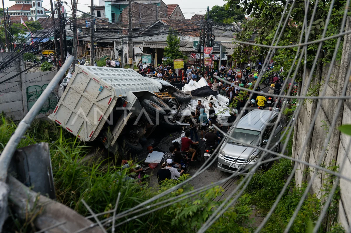 Kondisi truk yang rusak akibat terjun dari ruas tol Tangerang-Merak di Kaligandu, Kota Serang, Banten, Sabtu (4/10/2025). Kecelakaan truk tronton bernomor polisi B 9235 KIS yang melaju dari arah Tangerang menuju Merak tersebut diduga akibat sopir mengantuk sehingga mengakibatkan truk terjun bebas hingga ke underpass pas tol pada pukul 14.00 WIB dan menyebabkan dua kendaraan tertimpa, serta lima orang dilarikan ke rumah sakit. ANTARA FOTO/Muhammad Bagus Khoirunas/nz