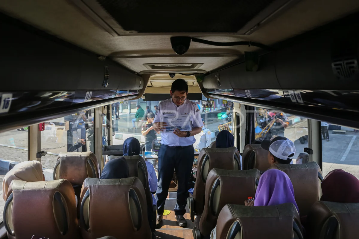 Petugas menjelaskan rute bus Trans Banten kepada penumpang usai peluncuran di Terminal Pakupatan, Kota Serang, Banten, Sabtu (4/10/2025). Pemerintah Provinsi Banten resmi mengoperasikan sebanyak dua bus Trans Banten koridor Terminal Pakupatan, Kota Serang-Halte Untirta Sindangsari, Kabupaten Serang yang digratiskan hingga akhir tahun 2025 untuk mendorong minat masyarakat menggunakan transportasi publik. ANTARA FOTO/Angga Budhiyanto/nz