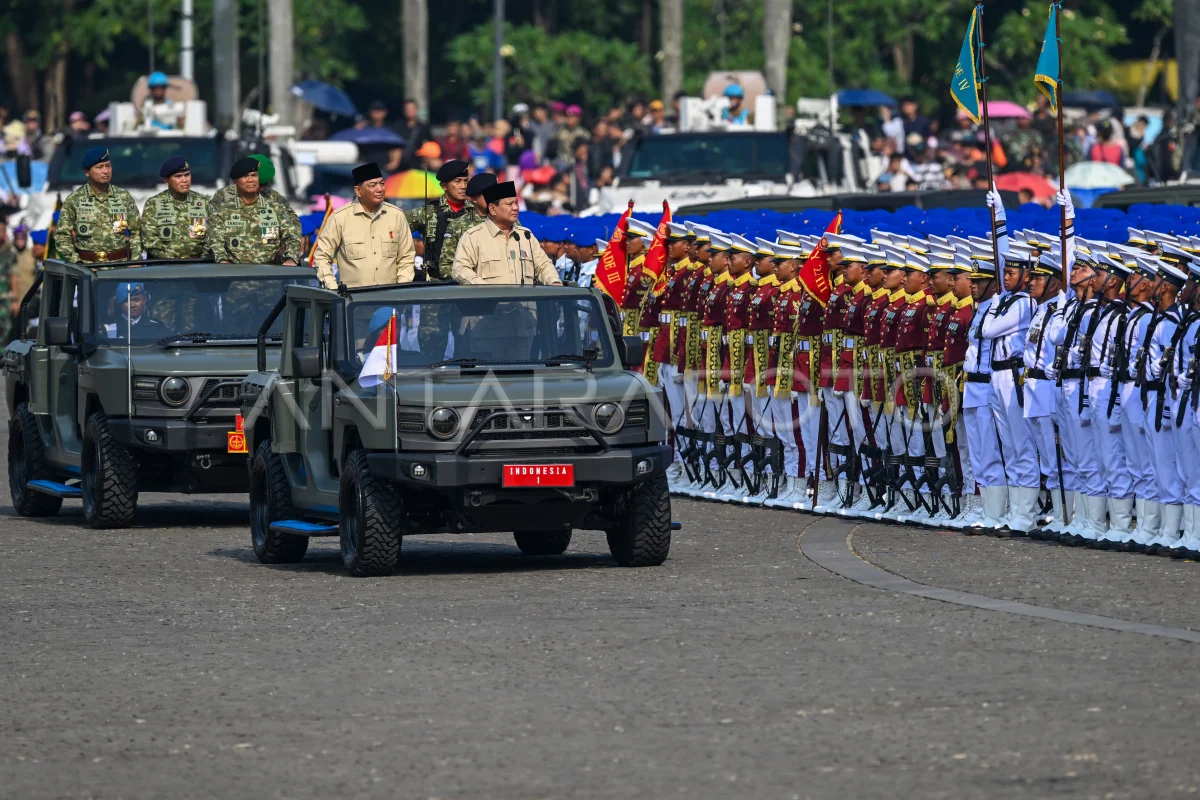 Presiden Prabowo Subianto (keenam kiri), Menteri Pertahanan Sjafrie Sjamsoeddin (keempat kiri), Wakil Panglima TNI Jenderal TNI Tandyo Budi Revita (ketiga kiri) KSAL Laksamana TNI Muhammad Ali (kedua kiri), KSAU Marsekal TNI Tonny Harjono (kiri) memeriksa pasukan saat upacara peringatan Hari Ulang Tahun (HUT) ke-80 Tentara Nasional Indonesia (TNI) di Monas, Jakarta, Minggu (5/10/2025). Peringatan HUT ke-80 TNI mengusung tema TNI Prima, TNI Rakyat, Indonesia Maju. ANTARA FOTO/Fauzan/nym.