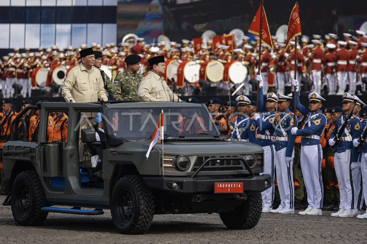 Presiden Prabowo Subianto (kanan) didampingi Menteri Pertahanan Sjafrie Sjamsoeddin (kiri) dan Panglima TNI Jenderal TNI Agus Subiyanto (kedua kanan) melaksanakan inspeksi pasukan pada Upacara HUT ke-80 TNI di kawasan Silang Monas, Jakarta, Minggu (5/10/2025). Peringatan HUT ke-80 TNI mengangkat tema besar TNI Prima, TNI Rakyat, Indonesia Maju. ANTARA FOTO/Dhemas Reviyanto/nym.