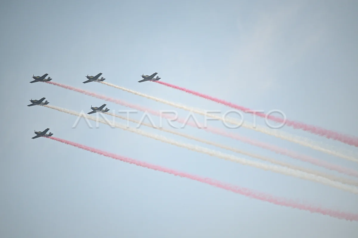 Pesawat Beechcraft Bonanza G36 melakukan demonstrasi udara pada peringatan Hari Ulang Tahun (HUT) ke-80 Tentara Nasional Indonesia (TNI) di Monas, Jakarta, Minggu (5/10/2025). Peringatan HUT ke-80 TNI mengusung tema TNI Prima, TNI Rakyat, Indonesia Maju. ANTARA FOTO/Fauzan