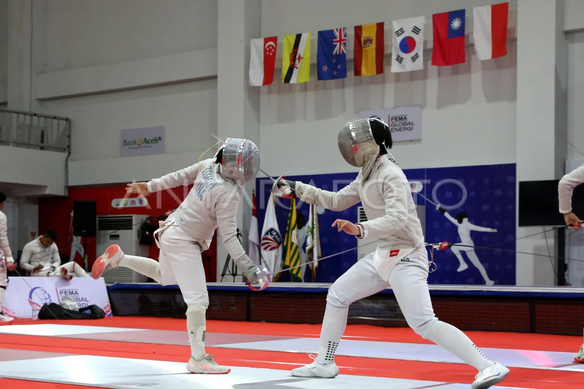Atlet anggar Indonesia Muhammad Zuhdi (kiri) bertanding melawan atlet anggar Brunai Darussalam Muhammad Hariz Zakaria (kanan) pada semifinal kelas sabel beregu putra kejuaraan anggar Indonesia terbuka 2025 (Indonesia Fencing Open 2025) di komplek stadion Harapan Bangsa, Banda Aceh, Aceh, Minggu (5/10/2025). Indonesia Fencing Open 2025 diikuti 120 atlet dari berbagai provinsi juga atlet anggar dari negara Malaysia, Kamboja, Thailand, Brunei Darussalam, Taiwan, dan Australia. ANTARA FOTO/Irwansyah Putra/foc.
