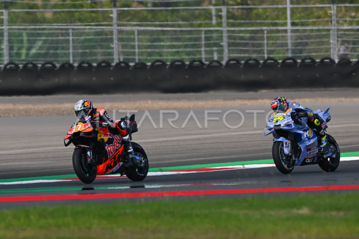 Pembalap BK8 Gresini Racing MotoGP Fermin Aldeguer (kanan) dan pembalap Red Bull KTM Factory Racing Pedro Acosta (kiri) memacu kecepatan sepeda motornya dalam race MotoGP Indonesia 2025 di Sirkuit Internasional Pertamina Mandalika, Lombok Tengah, Nusa Tenggara Barat, Minggu (5/10/2025). Fermin Aldeguer memenangi seri balapan seri ke-18 MotoGP ini setelah finis pertama, sementara posisi kedua diraih oleh Pedro Acosta dan posisi ketiga diraih pembalap BK8 Gresini Racing MotoGP Alex Marquez. ANTARA FOTO/Aditya Pradana Putra/foc.