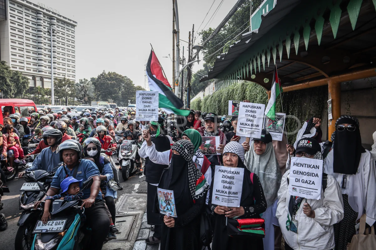 Peserta yang tergabung dalam Free Palestine Network membawa poster dukungan saat aksi solidaritas Palestina di Kawasan Tugu Tani, Jakarta, Minggu (5/10/2025). Aksi yang dilaksanakan serentak di berbagai daerah tersebut merupakan bentuk solidaritas untuk rakyat Palestina dan mendesak pemerintah Amerika Serikat untuk menghentikan dukungan terhadap Israel. ANTARA FOTO/Muhammad Rizky Febriansyah/bay/foc.