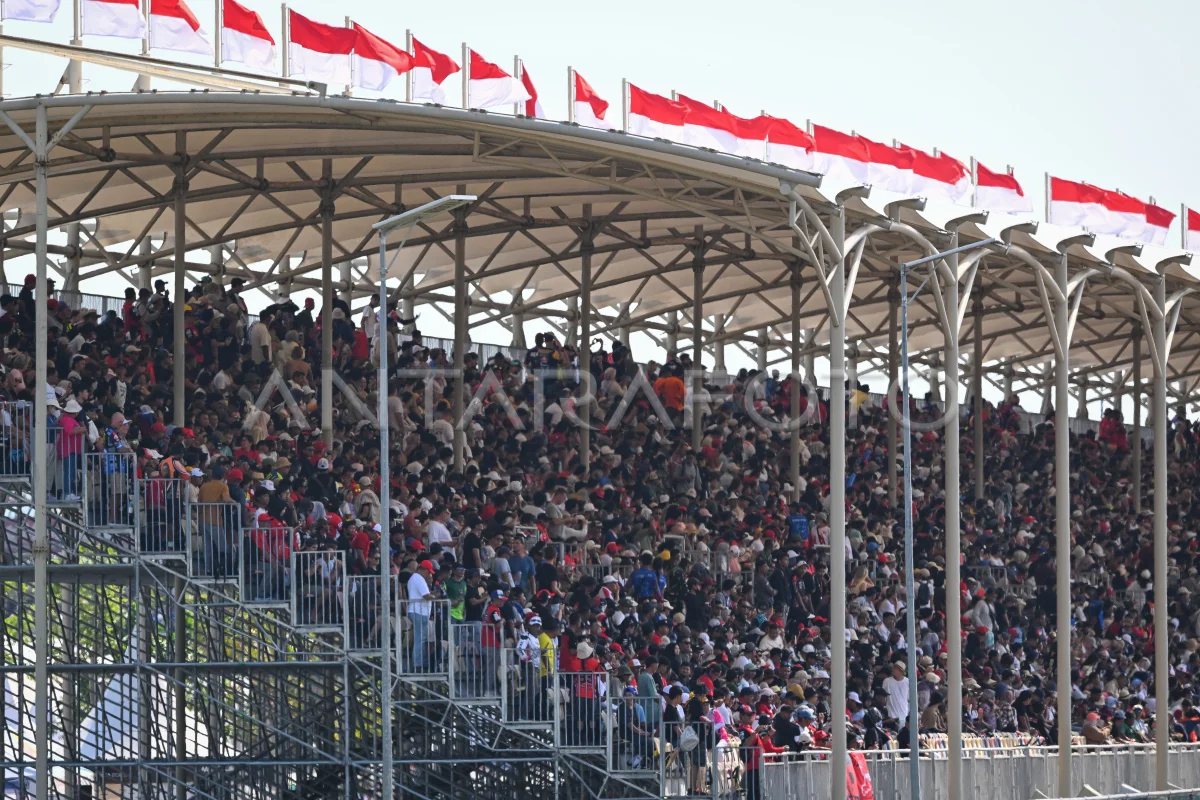 Sejumlah penonton menyaksikan race MotoGP Indonesia 2025 di Sirkuit Internasional Pertamina Mandalika, Lombok Tengah, Nusa Tenggara Barat, Minggu (5/10/2025). Penyelenggaraan MotoGP Indonesia tahun ini memecahkan rekor penonton terbanyak dibandingkan penyelenggaraan tiga edisi sebelumnya atau kali ini mencapai 140.324 penonton. ANTARA FOTO/Aditya Pradana Putra/foc.