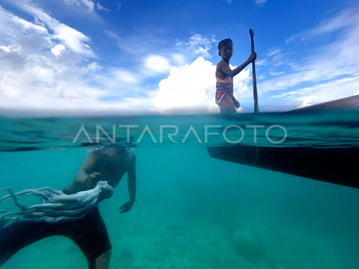 Seorang nelayan Suku Bajo ditemani anaknya memegang gurita yang berhasil ditangkap dengan menggunakan panah tradisional di perairan Mola Selatan, Wakatobi, Sulawesi Tenggara, Senin (6/10/2025). Nelayan Suku Bajo hanya menggunakan alat panah tradisional untuk berburu ikan dan sejenisnya di dalam laut dan cara ini telah dilakukan secara turun temurun sejak dulu. ANTARA FOTO/Jojon/tom.