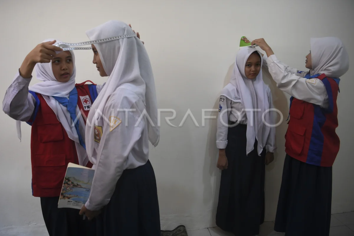 Petugas UKS memeriksa kesehatan siswa di SMP Negeri 13 Depok, Jawa Barat, Senin (6/10/2025). SPPG Cinere melibatkan puskesmas dan usaha kesehatan sekolah (UKS) untuk memantau secara berkala Satuan Pelayanan Pemenuhan Gizi (SPPG) atau dapur MBG guna memastikan pemenuhan gizi serta antisipasi kasus keracunan. ANTARA FOTO/Galih Pradipta/YU