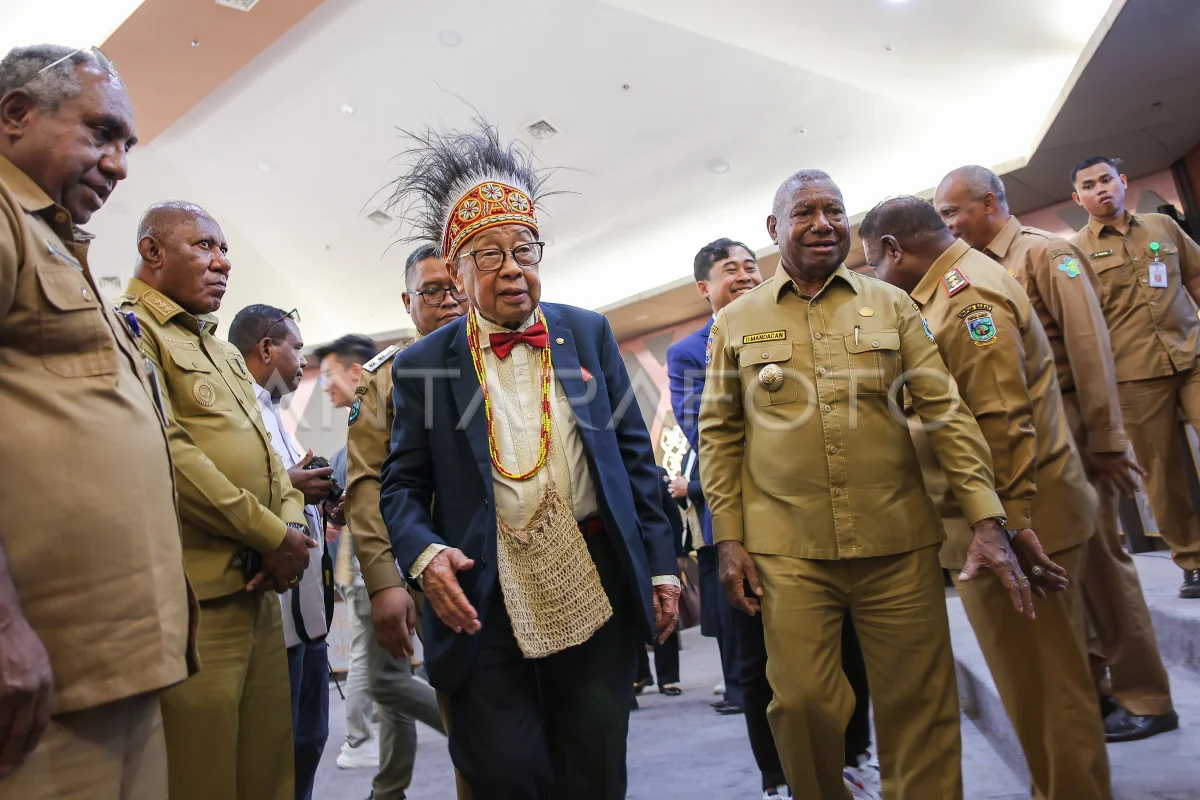 Gubernur Papua Barat Dominggus Mandacan (keempat kanan) bersama Ketua Delegasi China yang juga Presiden Akademisi Internasional Pusat Inovasi Sains dan Teknologi China C.C. Chan (ketiga kiri) berjalan usai pertemuan di ruangan Multimedia Kantor Gubernur Papua Barat, Papua Barat, Senin( 6/10/2025). Pertemuan strategis tersebut merupakan penjajakan peluang kemitraan China dengan Papua Barat dalam pengembangan riset, inovasi teknologi, serta pengelolaan sumber daya alam berkelanjutan. ANTARA FOTO/Chairil Indra/sgd/YU