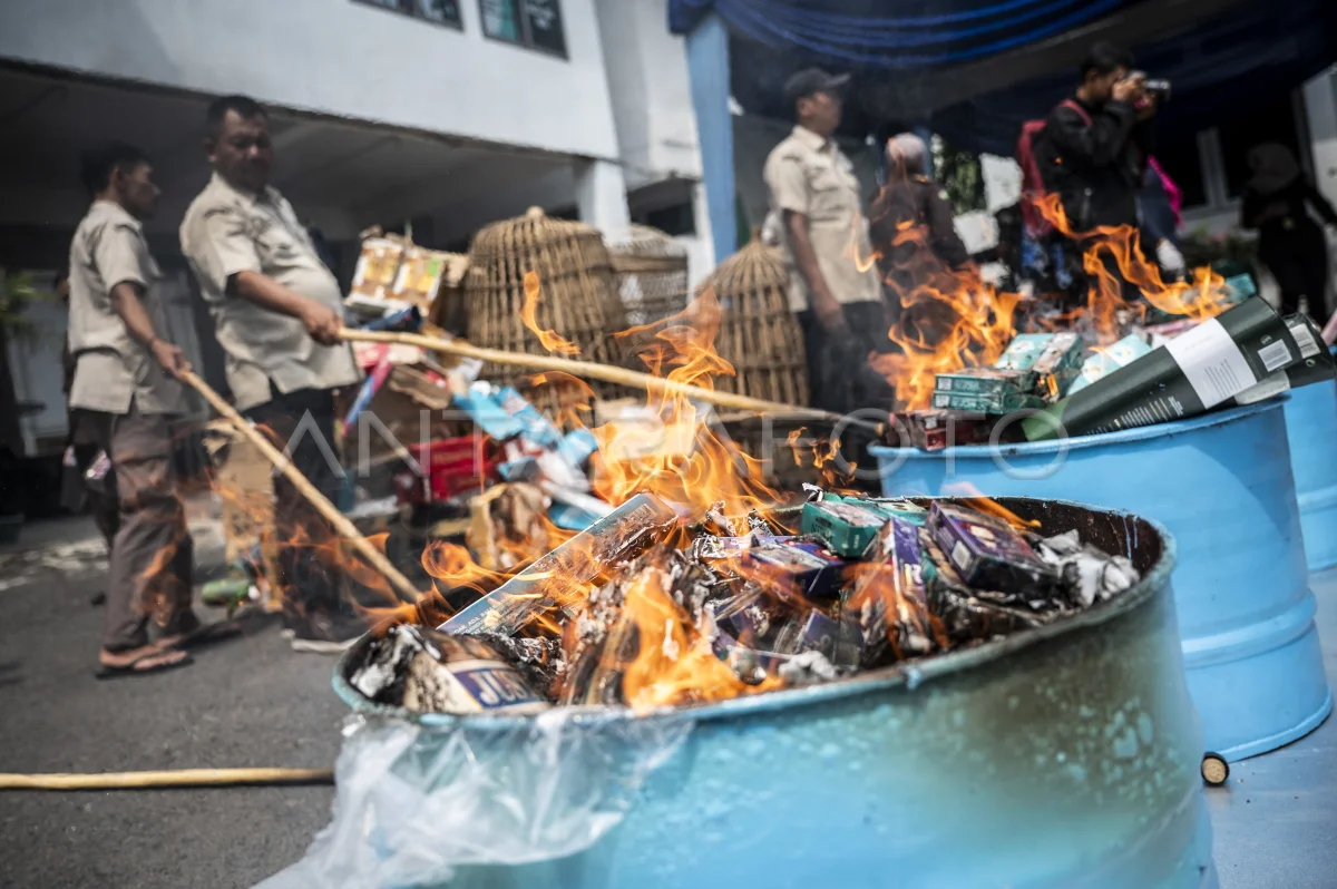 Petugas memusnahkan barang bukti rokok ilegal dalam rilis di halaman Kantor Kejaksaan Negeri Kota Semarang, Jawa Tengah, Selasa (7/10/2025). Kejaksaan Negeri Kota Semarang memusnahkan barang bukti dari 97 perkara, berupa 19.496 botol minuman keras, 32 unit gawai, 13 senjata tajam, 76 koli dan 86 karton rokok ilegal, serta narkotika dan psikotropika. ANTARA FOTO/Aprillio Akbar/nz