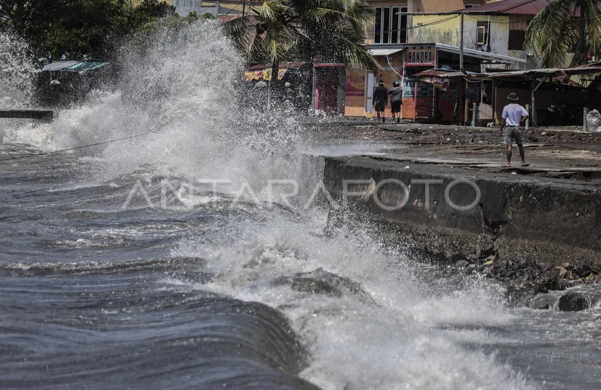 Gelombang tinggi mengempas ke batu pemecah ombak di Bastiong Ternate, Maluku Utara, Selasa (7/10/2025). BMKG Stasiun Meteorologi Kelas I Sultan Baabullah Ternate mengeluarkan peringatan dini cuaca ekstrem yang mencakup gelombang tinggi mencapai 2,2 meter di perairan sekitar Maluku Utara dan warga yang tinggal di wilayah pesisir agar tetap waspada menghadapi potensi cuaca ekstrem yang dapat memicu gelombang tinggi.ANTARA FOTO/Andri Saputra/nz