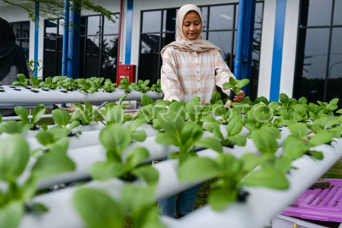 Peserta memeriksa kondisi tanaman pakcoi yang ditanam secara hidroponik saat pelatihan di Balai Besar Pelatihan Vokasi dan Produktivitas (BBPVP) Serang, Kota Serang, Banten, Selasa (7/10/2025). Pelatihan pertanian hidroponik dengan menggunakan sistem otomatisasi modern tersebut merupakan program Project Based Learning (PBL) Kementerian Ketenagakerjaan yang bertujuan untuk mencetak tenaga kerja kompeten dan adaptif di sektor pertanian. ANTARA FOTO/Muhammad Bagus Khoirunas/nz