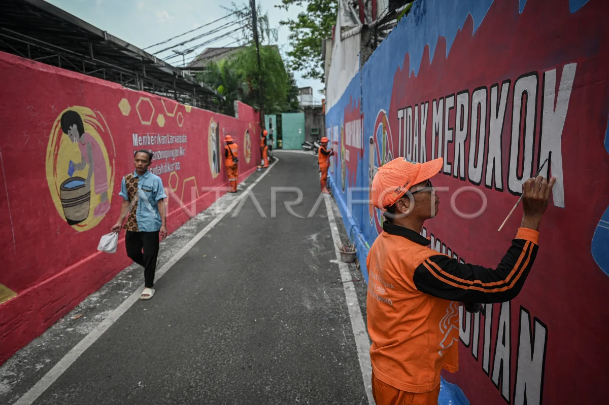 Petugas PPSU membuat mural ajakan hidup sehat di kawasan Pancoran, Jakarta, Selasa (7/10/2025). Mural sepanjang 80 meter tersebut selain untuk mempercantik kota juga sebagai media guna mengampanyekan pola hidup sehat kepada masyarakat. ANTARA FOTO/Fauzan/tom.