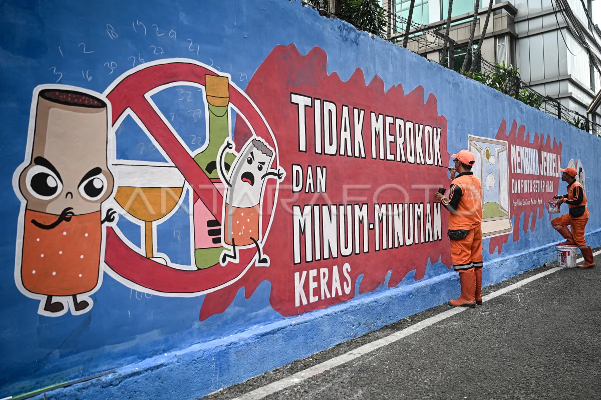 Petugas PPSU membuat mural ajakan hidup sehat di kawasan Pancoran, Jakarta, Selasa (7/10/2025). Mural sepanjang 80 meter tersebut selain untuk mempercantik kota juga sebagai media guna mengampanyekan pola hidup sehat kepada masyarakat. ANTARA FOTO/Fauzan/tom.