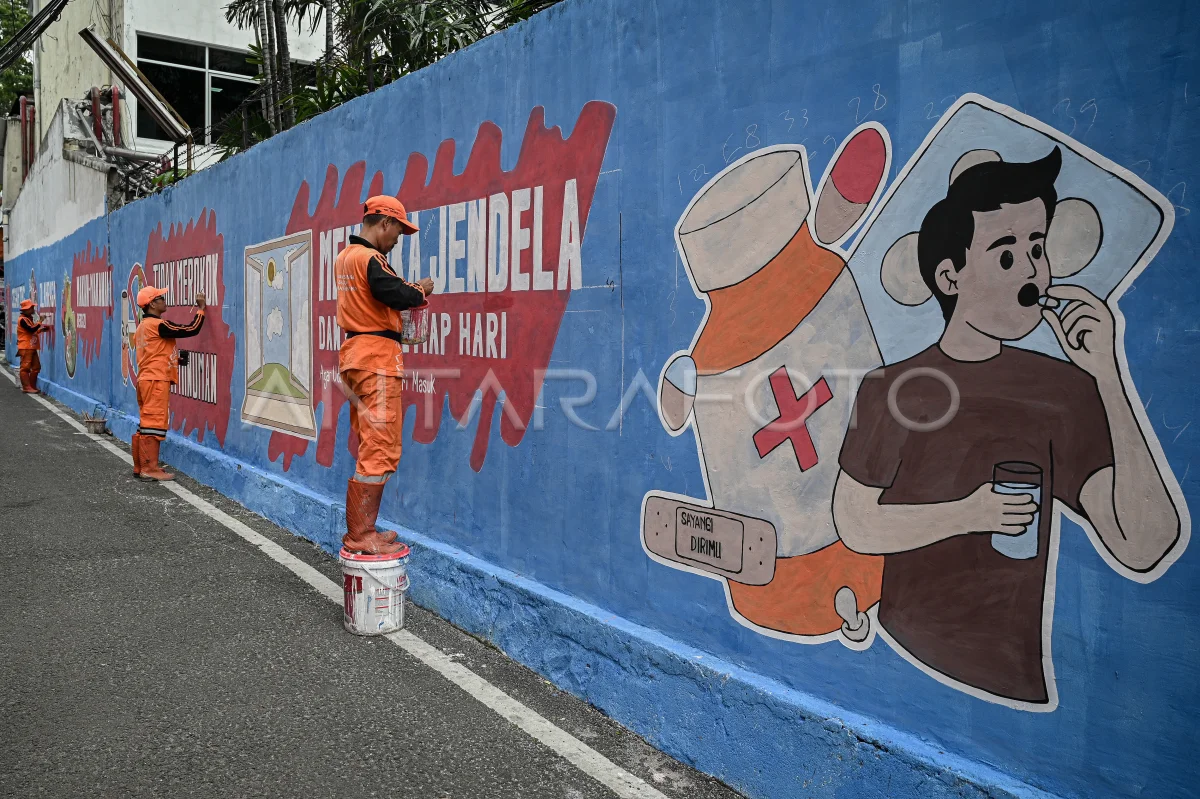 Petugas PPSU membuat mural ajakan hidup sehat di kawasan Pancoran, Jakarta, Selasa (7/10/2025). Mural sepanjang 80 meter tersebut selain untuk mempercantik kota juga sebagai media guna mengampanyekan pola hidup sehat kepada masyarakat. ANTARA FOTO/Fauzan/tom.