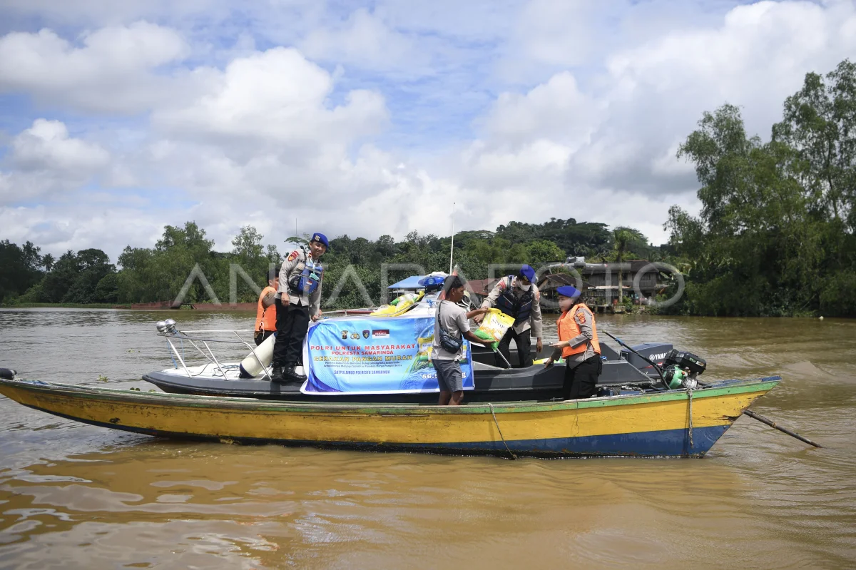 Anggota Polairud Polresta Samarinda melayani warga membeli beras SPHP saat Gerakan Pangan Murah (GPM) di perairan Sungai Mahakam kawasan Loa Kumbar, Kelurahan Loa Buah, Kecamatan Sungai Kunjang, Samarinda, Kalimantan Timur, Selasa (7/10/2025). Polairud Polresta Samarinda bekerja sama dengan Bulog Samarinda dalam upaya menjaga stabilitas pasokan dan harga pangan beras itu menjual 300 karung beras SPHP seharga Rp56.500 per 5 kilogramnya sebagai bentuk nyata kehadiran Polri di tengah masyarakat pesisir sekaligus mendukung ketahanan pangan dan menekan fluktuasi harga beras di wilayah hukum Polresta Samarinda. ANTARA FOTO/M Risyal Hidayat/tom.