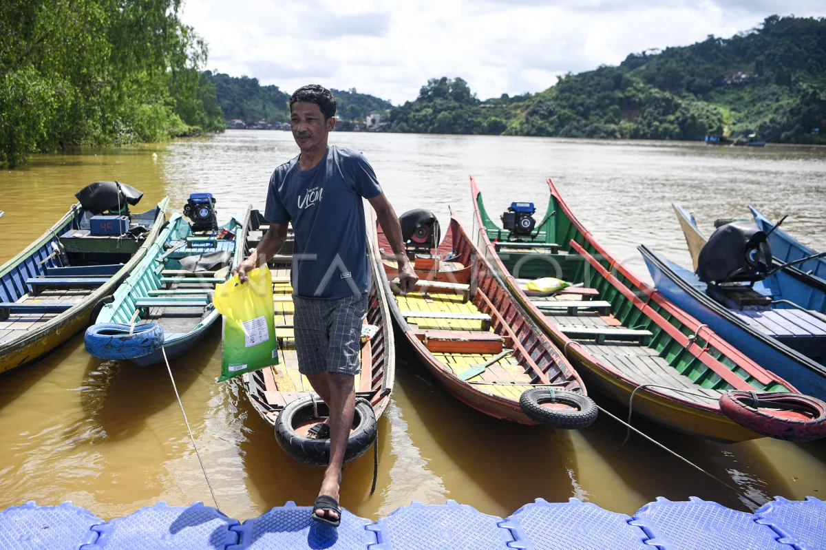 Warga membawa beras SPHP yang dibeli dari anggota Polairud Polresta Samarinda saat Gerakan Pangan Murah (GPM) di perairan Sungai Mahakam kawasan Loa Kumbar, Kelurahan Loa Buah, Kecamatan Sungai Kunjang, Samarinda, Kalimantan Timur, Selasa (7/10/2025). Polairud Polresta Samarinda bekerja sama dengan Bulog Samarinda dalam upaya menjaga stabilitas pasokan dan harga pangan beras itu menjual 300 karung beras SPHP seharga Rp56.500 per 5 kilogramnya sebagai bentuk nyata kehadiran Polri di tengah masyarakat pesisir sekaligus mendukung ketahanan pangan dan menekan fluktuasi harga beras di wilayah hukum Polresta Samarinda. ANTARA FOTO/M Risyal Hidayat/tom.