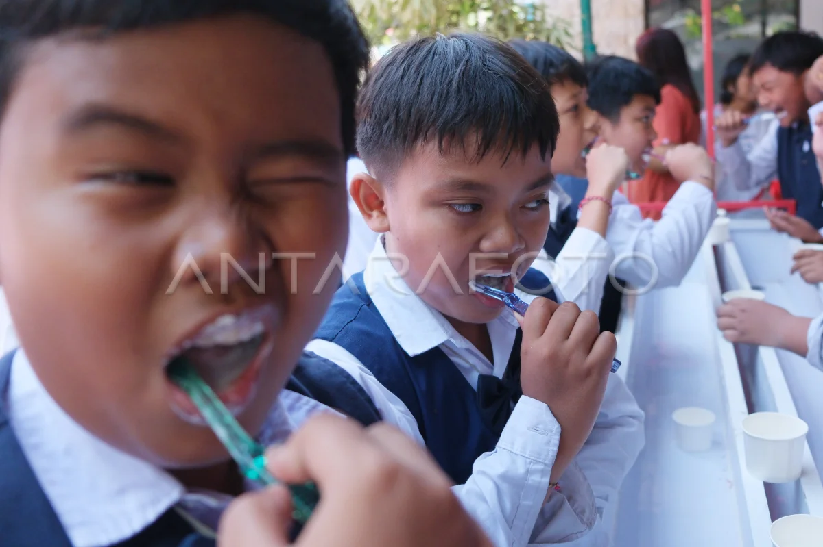 Siswa SD mengikuti acara gosok gigi bersama saat Bulan Kesehatan Gigi Nasional (BKGN) 2025 di Rumah Sakit Gigi dan Mulut Pendidikan (RSGMP) Saraswati Denpasar, Bali, Rabu (8/10/2025). Kegiatan yang berlangsung 8-10 Oktober 2025 tersebut mengusung tema Cek Gigi dan Gusi â Bebas Biaya, Bebas Cemas, Bebas Ribet untuk memberikan edukasi terkait kesehatan gigi dan gusi serta pelayanan pemeriksaan gratis kepada masyarakat dengan target lebih dari 750 orang selama tiga hari. ANTARA FOTO/Nyoman Hendra Wibowo/bar