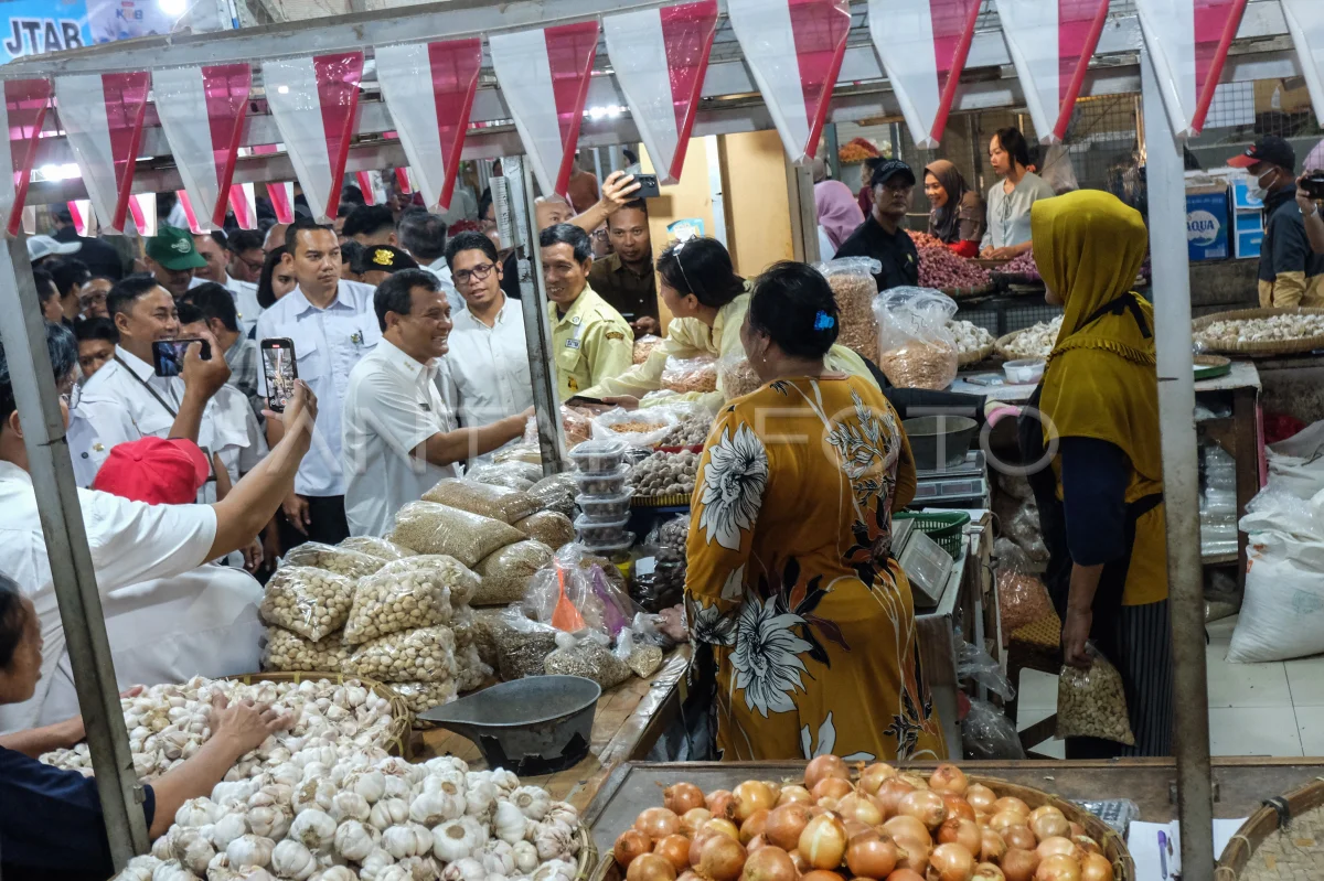 Gubernur Jawa Tengah Ahmad Luthfi (ketiga kiri) berbincang dengan pedagang saat meninjau operasional kios Jawa Tengah Argo Berdikari (JTAB) di Pasar Legi, Solo, Jawa Tengah, Rabu (8/10/2025). Keberadaan kios binaan BUMD Jawa Tengah tersebut sebagai upaya Pemprov Jawa Tengah mengintervensi harga bahan pokok dan mencegah permainan tengkulak. ANTARAFOTO/Maulana Surya/bar