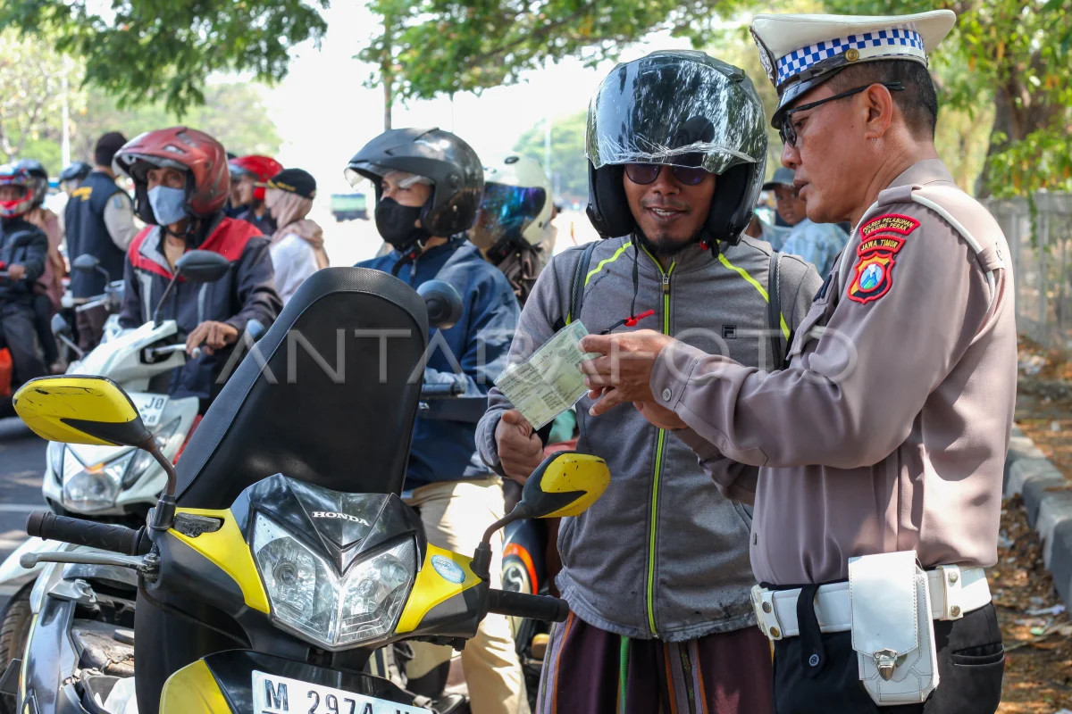 Polisi memeriksa surat kendaraan bermotor milik warga yang terjaring Operasi Bersama Pajak Kendaraan Bermotor di Jalan Kedung Cowek, Surabaya, Jawa Timur, Rabu (8/10/2025). Badan Pendapatan Daerah bersama pihak kepolisian setempat melakukan operasi yang bersifat persuasif di tempat itu sebagai upaya meningkatkan kesadaran masyarakat membayar pajak kendaraan bermotor tepat waktu sekaligus untuk meningkatkan pendapatan daerah. ANTARA FOTO/Didik Suhartono/bar