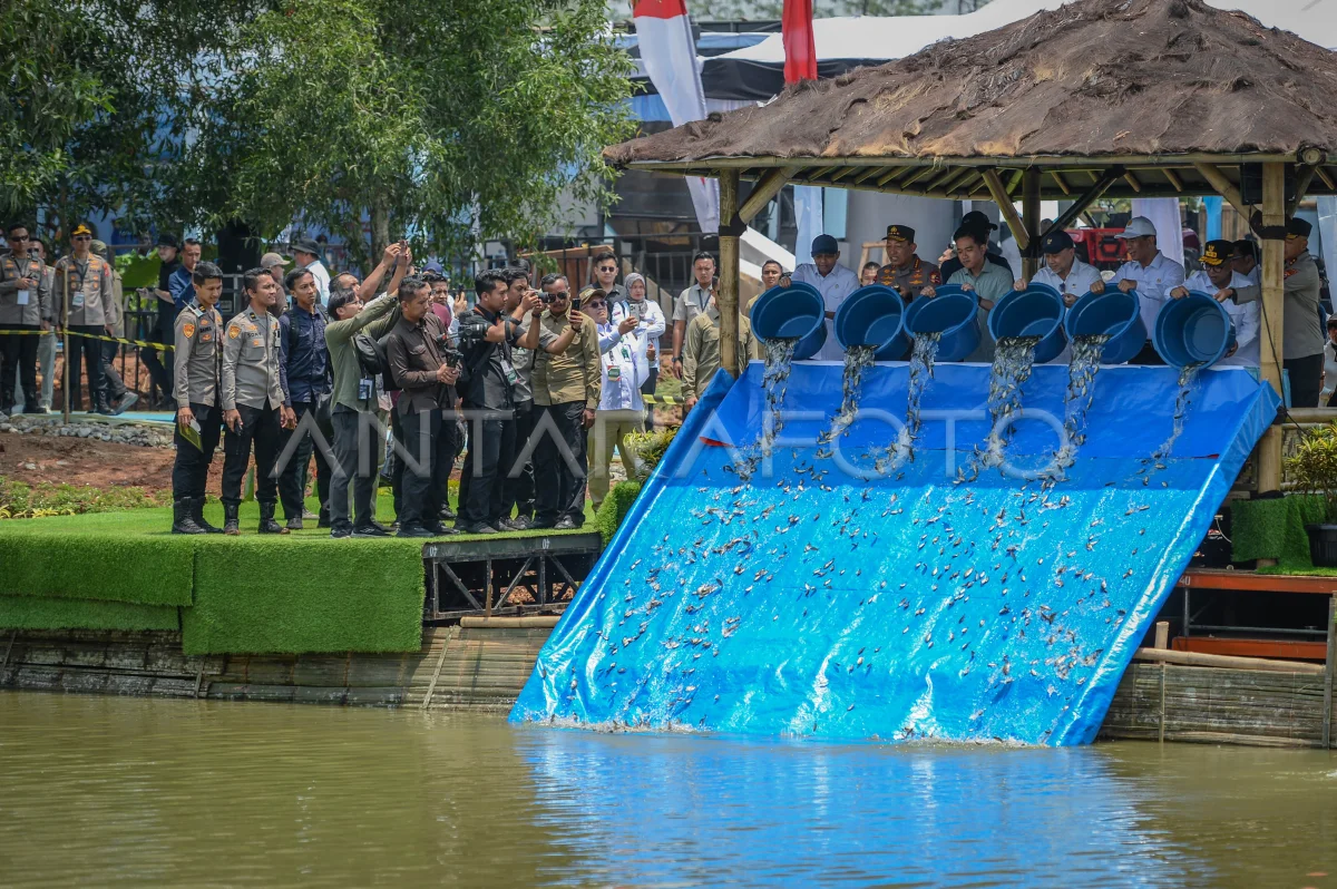 Wakil Presiden Gibran Rakabuming Raka (keempat kanan) bersama Menteri Koordinator Pangan Zulkifli Hasan (ketiga kanan), Menteri Pertanian Andi Amran Sulaiman (kedua kanan), Menteri Kehutanan Raja Juli Antoni (keenam kanan), Kapolri Jenderal Listyo Sigit Prabowo (kelima kanan) dan Gubernur Banten Andra Soni (kanan) menebar bibit ikan nila saat kegiatan penanaman jagung serentak kuartal IV tahun 2025 di Desa Bantar Panjang, Tigaraksa, Kabupaten Tangerang, Banten, Rabu (8/10/2025). Penanaman jagung serentak seluas 3.861 hektare lahan di seluruh wilayah Indonesia dengan memberdayakan 602.208 petani tersebut guna mendukung penguatan ketahanan pangan dalam negeri. ANTARA FOTO/Putra M. Akbar/bar
