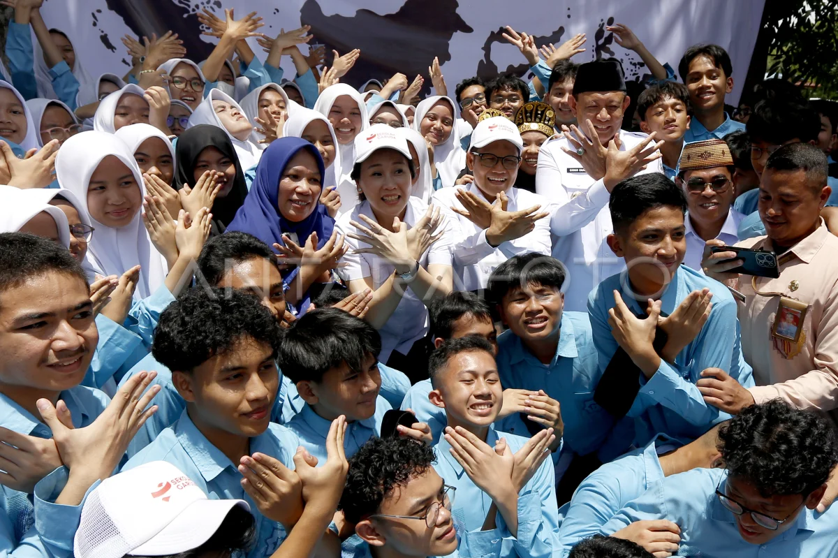 Menteri Koordinator Bidang Pemberdayaan Masyarakat Republik Indonesia Muhaimin Iskandar (keempat kanan) bersama Wakil Menteri Pemberdayaan Perempuan dan Perlindungan Anak Veronica Tan (kelima kanan) dab Gubernur Gorontalo Gusnar Ismail (ketiga kanan) berfoto bersama siswa pada pengenalan Sekolah Garuda di Madrasah Aliyah Negeri (MAN) Insan Cendikia, Kabupaten Bone Bolango, Gorontalo, Rabu (8/10/2025). Madrasah Aliyah Negeri Insan Cendikia yang memiliki 360 siswa, fasilitas digitalisasi dan asrama bagi siswa dan guru tersebut terpilih menjadi Sekolah Garuda dalam rangka penyeimbangan dan perluasan akses berprestasi serta akselerasi pengembangan talenta sains dan teknologi. ANTARA FOTO/Adiwinata Solihin/bar