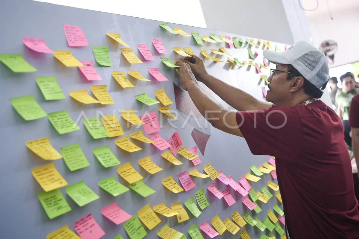 Mensos Saifullah Yusuf menempelkan tulisan harapan saat peresmian Sekolah Garuda Transformasi di SMAN 10 Samarinda, Kalimantan Timur, Rabu (8/10/2025). Mensos Saifullah Yusuf menjelaskan bahwa Sekolah Garuda merupakan salah satu Program Hasil Terbaik Cepat (Quick Win) Presiden Prabowo Subianto dalam pengembangan talenta sains dan teknologi yang diresmikan serentak di 16 lokasi di Indonesia. ANTARA FOTO/M Risyal Hidayat/bar