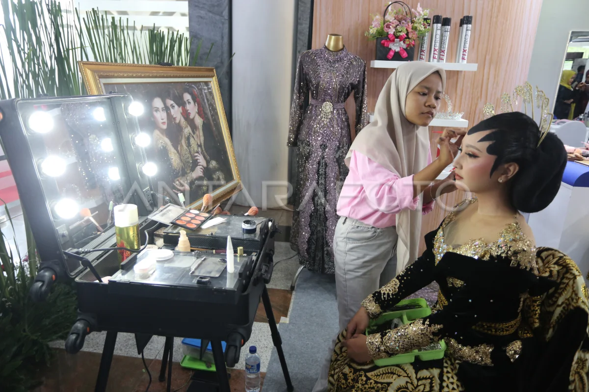 Siswi jurusan tata rias SMA Negeri 1 Saradan Madiun merias rekannya di salah satu stan pameran SMA Double Track di Graha ITS, Surabaya, Jawa Timur, Rabu (8/10/2025). Pameran menampilkan hasil karya keterampilan dalam program SMA Double Track Jawa Timur yang diberikan untuk bekal siswa siap bekerja ataupun untuk melanjutkan ke perguruan tinggi. ANTARA FOTO/Moch Asim/rwa.