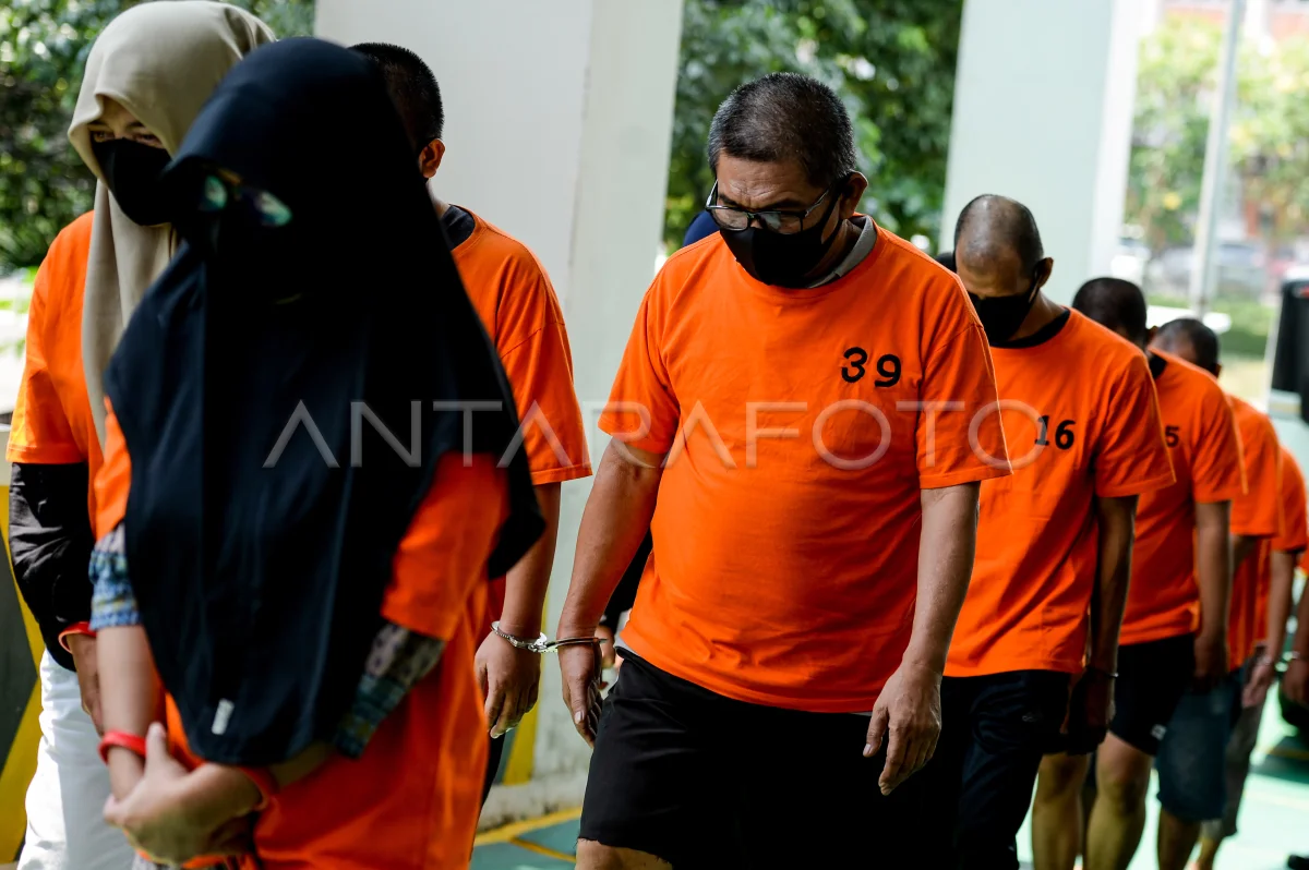 Sejumlah tersangka dihadirkan saat ungkap kasus tindak pidana perdagangan orang (TPPO) di Polres Bandara Soekarno-Hatta, Kota Tangerang, Banten, Kamis (9/10/2025). Kepolisian bersama Kantor Imigrasi Bandara dan BP3MI Banten berhasil mencegah sebanyak 430 calon pekerja migran Indonesia ilegal serta menetapkan 15 tersangka dan 24 DPO terkait kasus kejahatan TPPO yang melibatkan jaringan pekerja migran Indonesia ke luar negeri dengan berbagai tujuan seperti Kamboja, Laos, China dan Arab Saudi. ANTARA FOTO/Putra M. Akbar/foc.