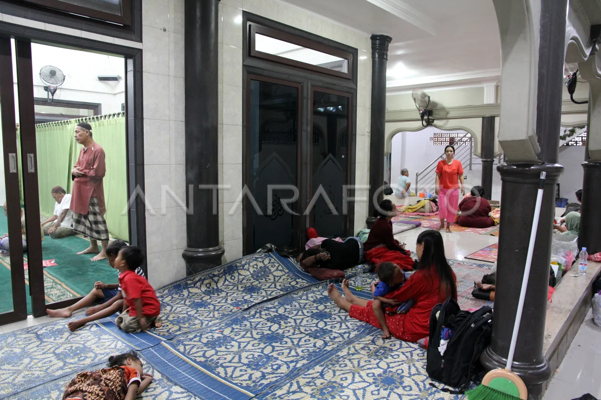 Warga terdampak banjir mengungsi di masjid di Kecamatan Medan Labuhan, Medan, Sumatera Utara, Minggu (12/10/2025). BPBD Kota Medan mencatat sebanyak 3.181 rumah terdampak banjir dan 845 jiwa dari empat kecamatan mengungsi. ANTARA FOTO/Yudi Manar/tom.