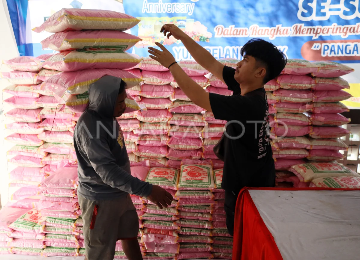 Pekerja mengusung beras saat kegiatan Gerakan Pangan Murah di Mamuju, Sulawesi Barat, Kamis (16/10/2025). Kegiatan dalam rangka peringatan Hari Pangan Sedunia itu digelar Serentak di Sulawesi Barat sebagai upaya mencegah inflasi daerah sekaligus stabilisasi pasokan dan harga pangan guna mewujudkan kesejahteraan masyarakat. ANTARAFOTO/ Akbar Tado/nz.