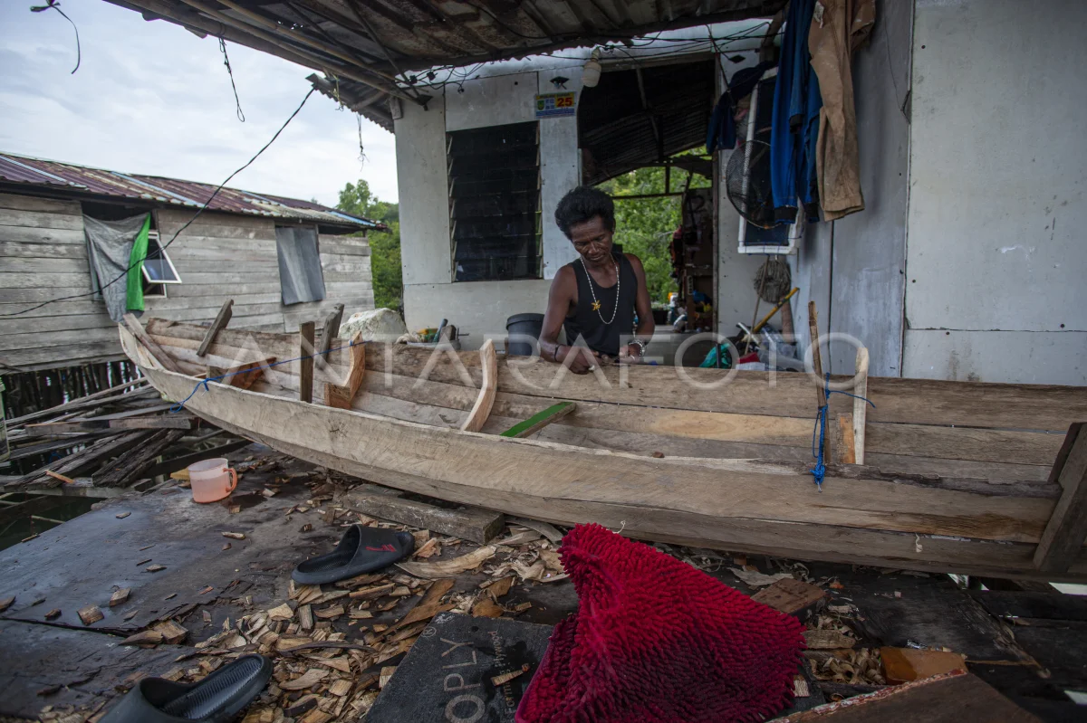 Seorang warga keturunan Suku Laut membuat perahu di depan rumahnya di permukiman Suku Laut Pulau Gara, Batam, Kepulauan Riau, Jumat (17/10/2025). Tercatat sebanyak 87 kepala keluarga Suku Laut menetap di pulau tersebut dan masih mempertahankan tradisi hidup pesisir yang bergantung pada hasil laut.ANTARA FOTO/Teguh Prihatna/YU